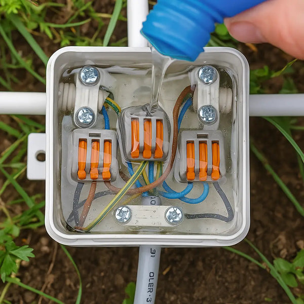 Abzweigdose, die mit Elektro Vergussmasse wasserdicht gemacht wurde.